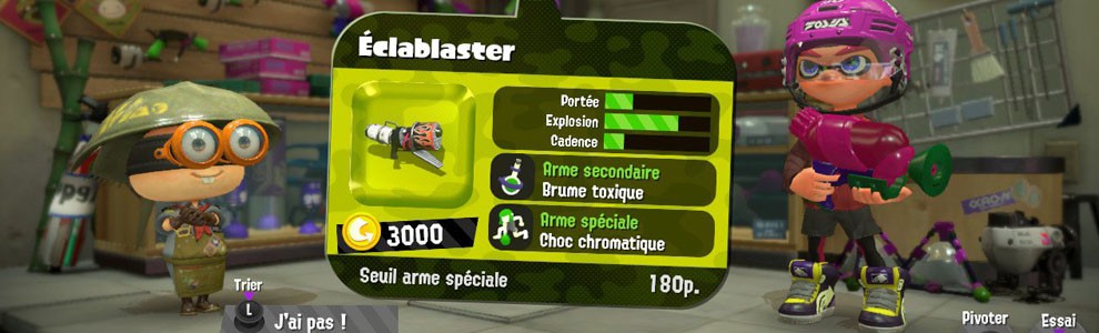 Dans Splatoon 2, il ne faut pas faire un amalgame entre la coquetterie et la classe. La mode y tient une place très importante. S’il s’agit avant tout d’avoir du style, il est aussi question de petits bonus. S’il nous reste encore assez d’argent à dépenser, trois boutiques du centre commercial Branchie garderont leurs portes ouvertes pour nous. On pourra s’acheter toutes sortes de couvre-chef chez Couvre-Seiche, des vêtements chez Culture Couture, et des chaussures chez Au pied Malin.La petite subtilité est que chaque accessoire est composé d’une à quatre aptitudes possibles, donnant donc quelques bonus au joueur. Cela va d’une amélioration de l’arme secondaire, en passant par une réduction de l’encre, une augmentation de la vitesse, etc. Un point non négligeable qu’il faudra prendre en compte lors d’un achat. Même si oui, on peut aussi s’acheter cette super casquette parce qu’on la trouve juste cool. Sachez tout de même que tout n’est pas figé et qu’il est possible de créer ses propres aptitudes, via un personnage traînant dans Chromapolis.