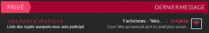 SHORTNEWS Factornews - "Mes participations" par Niko, le 21 July 2014 email @nik0tine Google+ Message de service - Réclamée à cors et à cris par nos membres inscrits, l'outil de suivi de discussions est désormais dispo sur le forum.