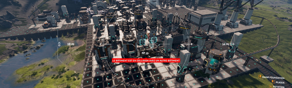Par contre, on pestera contre l'absence totale de barre rapide, obligeant à aller chercher les machines à la main dans les onglets des menus ou à copier celles présentes à l'écran avec des résultats pas toujours parfaits. On râlera aussi contre le fait que les nouvelles machines ou plateformes ne soient jamais à la hauteur de celles qu'on vise, obligeant à adapter l'altitude à chaque fois ou à utiliser la vue drone. Par ailleurs, certains piliers de rails nécessitent d'abord de détruire la plateforme existante au lieu de la remplacer purement et simplement. Sur le volet technique, si le titre tourne plutôt correctement, il subit souvent de gros freezes à chaque machine posée et provoque aussi une grosse seconde de blocage à chaque sauvegarde automatique. Du côté des combats, on pourra aussi regretter que les araignées détectent le joueur dès qu'il est à portée même si elles ne le voient pas. Heureusement, la musique de combat nous indique qu'on est pris en chasse mais on cherche malgré tout à savoir par quoi.