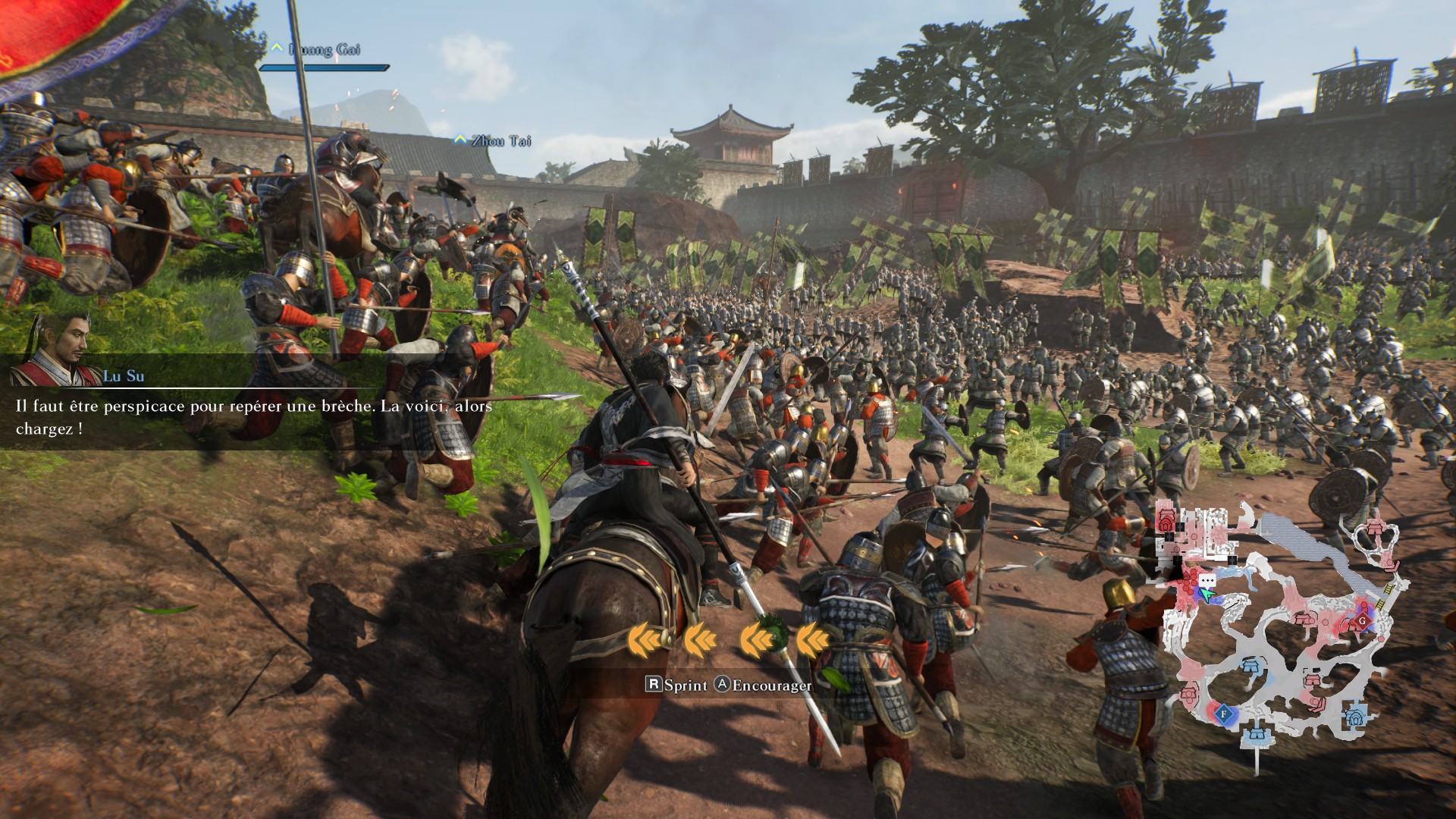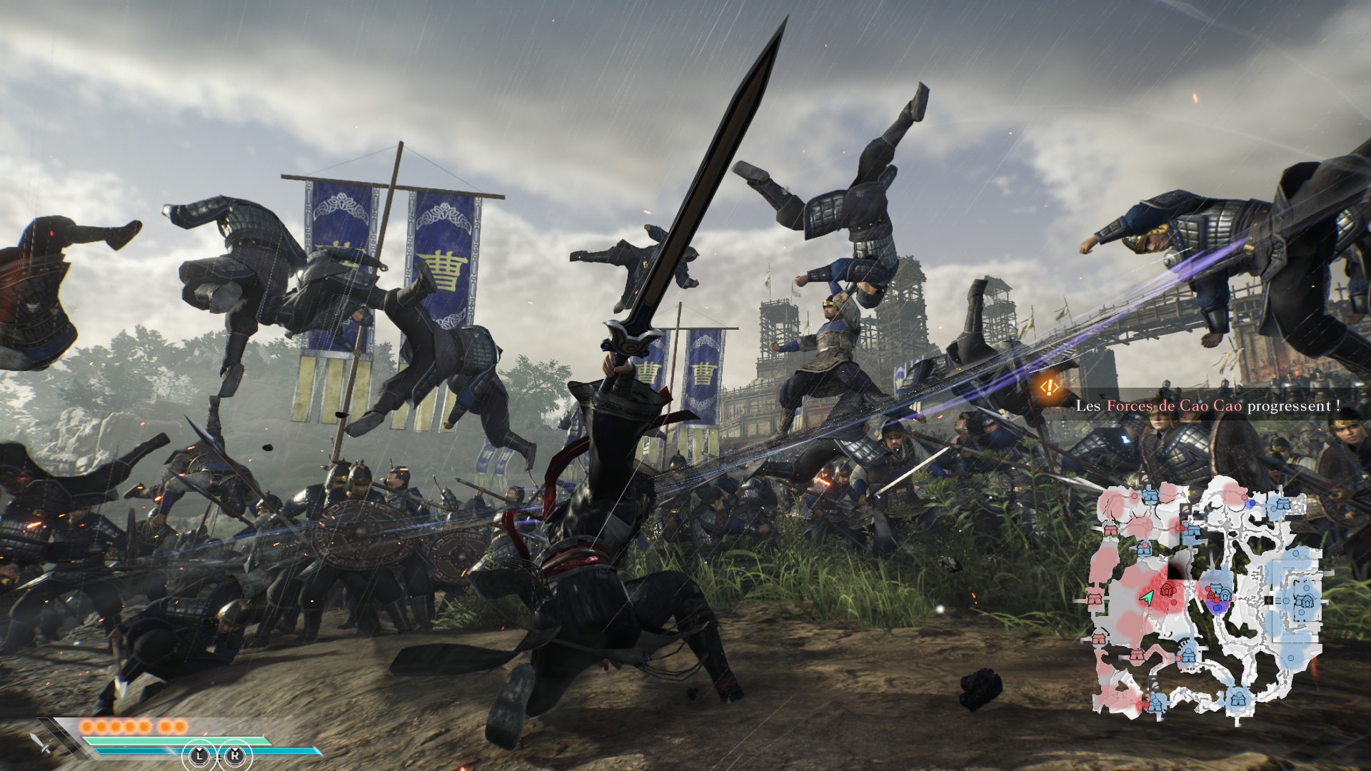 L'autre grande nouveauté des rixes de ce Dynasty Warriors Origins, et c'est une première dans la série, c'est la possibilité de reprendre la partie à l'un des moments clés de la baston après un game over prématuré, ce qui permet d'éviter de se refader des débuts à la stratégie toujours un peu ronflante, à savoir nettoyer les bases ennemies et progresser sur la carte jusqu'au premier gros général à abattre. C'est surtout qu'en plus de se faire occire par un second couteau, il est désormais possible de perdre la faute à un allié tombé au combat. Ainsi, lorsque le jeu demande de venir en aide à l'un de nos militaires, il faut prendre le réflexe de grimper sur son cheval et faire le tour de la carte pour aider le PNJ en question en activant un mode de vision permettant de localiser plus facilement les têtes pensantes. Pour le reste, c'est du Dynasty Warriors dans le texte, ou presque. Huit armes différentes (dont des gantelets qui troquent l'allonge pour du DPS) qu'il faudra patiemment améliorer, pour débloquer des niveaux de personnages donnant accès à des arbres de compétences dans lesquels investir son XP (ouf). Les coups spéciaux des armes permettent de faucher des armées entières, ou de casser les patterns des attaques spéciales des généraux adverses. La sensation d'impact est bonne et les barres de spécial (et super spécial !) se chargent assez vite, ce qui offre régulièrement des instants de satisfaction en combat.