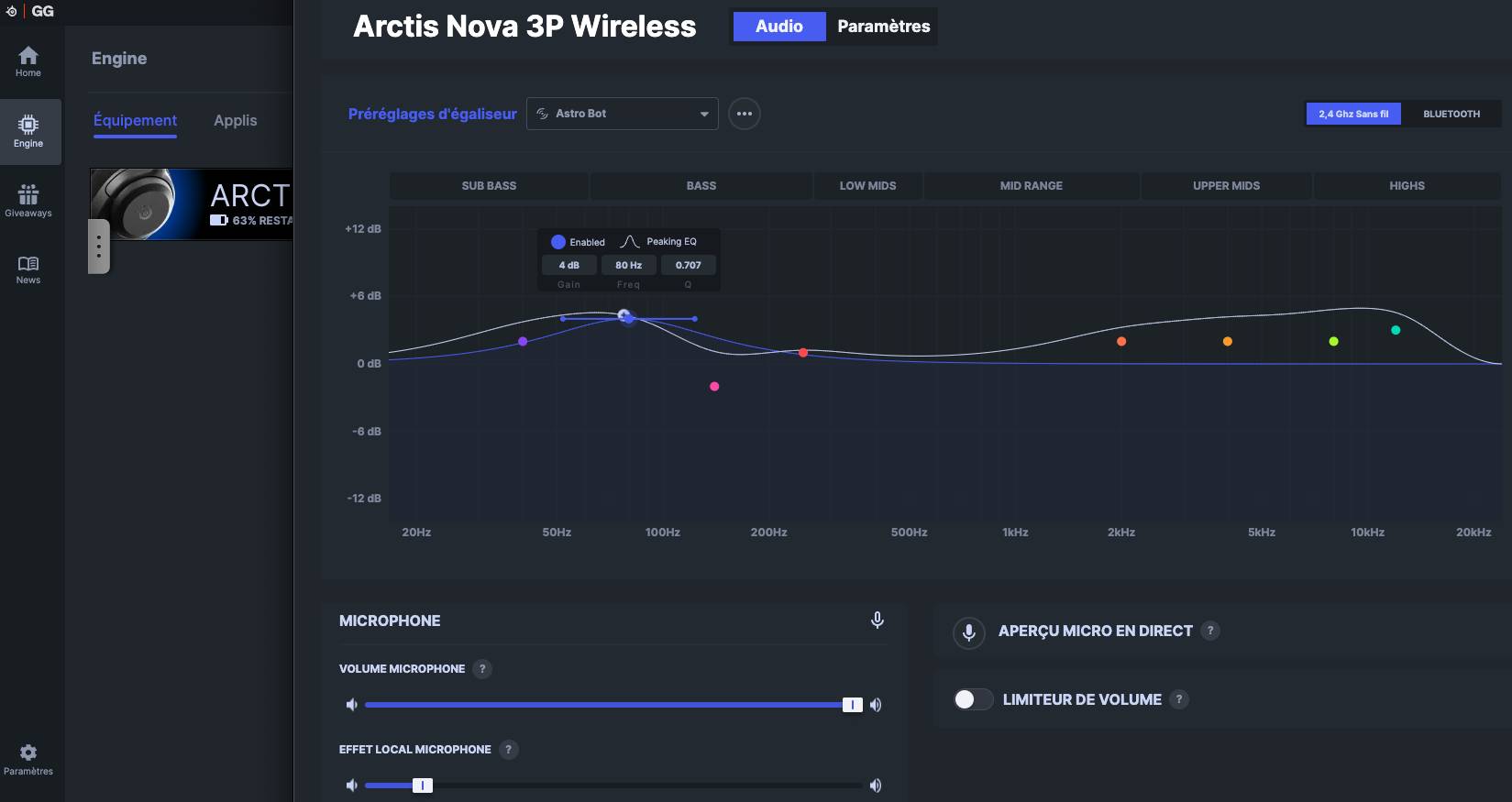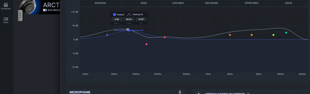 On a parlé du confort du casque. Maintenant, parlons du son. Au déballage, l'Arctis Nova 3 Wireless s'en sort surprenamment bien, encore une fois lorsqu'on le compare à d'autres produits du segment tarifaire. Et c'est en grande partie parce qu'il embarque les mêmes transducteurs que son aîné. Alors certes, on peut lui reprocher un préréglage d'usine qui laisse moins parler les aigüs et un manque d'audace dans la retranscription de l'intégralité du spectre. Mais de l'autre bord, il évite l'écueil des Beats et autres Turtle Beach qui écrasent la scène sonore derrière des basses proéminentes, voire carrément disgracieuses, pour masquer des économies sur la partie technique. De plus, une fois l'application GG installée sur son PC/Mac ou Arctis sur mobile, on peut complètement gommer les imperfections de ce profil audio "flat" à l'aide d'un égaliseur complet (et plus de 200 profils audio dédiés à tel ou tel jeu), qui permet même de sauvegarder nos réglages dans la mémoire interne du casque pour les emmener partout avec nous. Le Nova 3 Wireless offre en outre une stéréophonie plus que correcte, appréciable lors de parties en compétitif ou simplement lors de session d'écoute musicale, comme c'est souvent mon cas en télétravail.