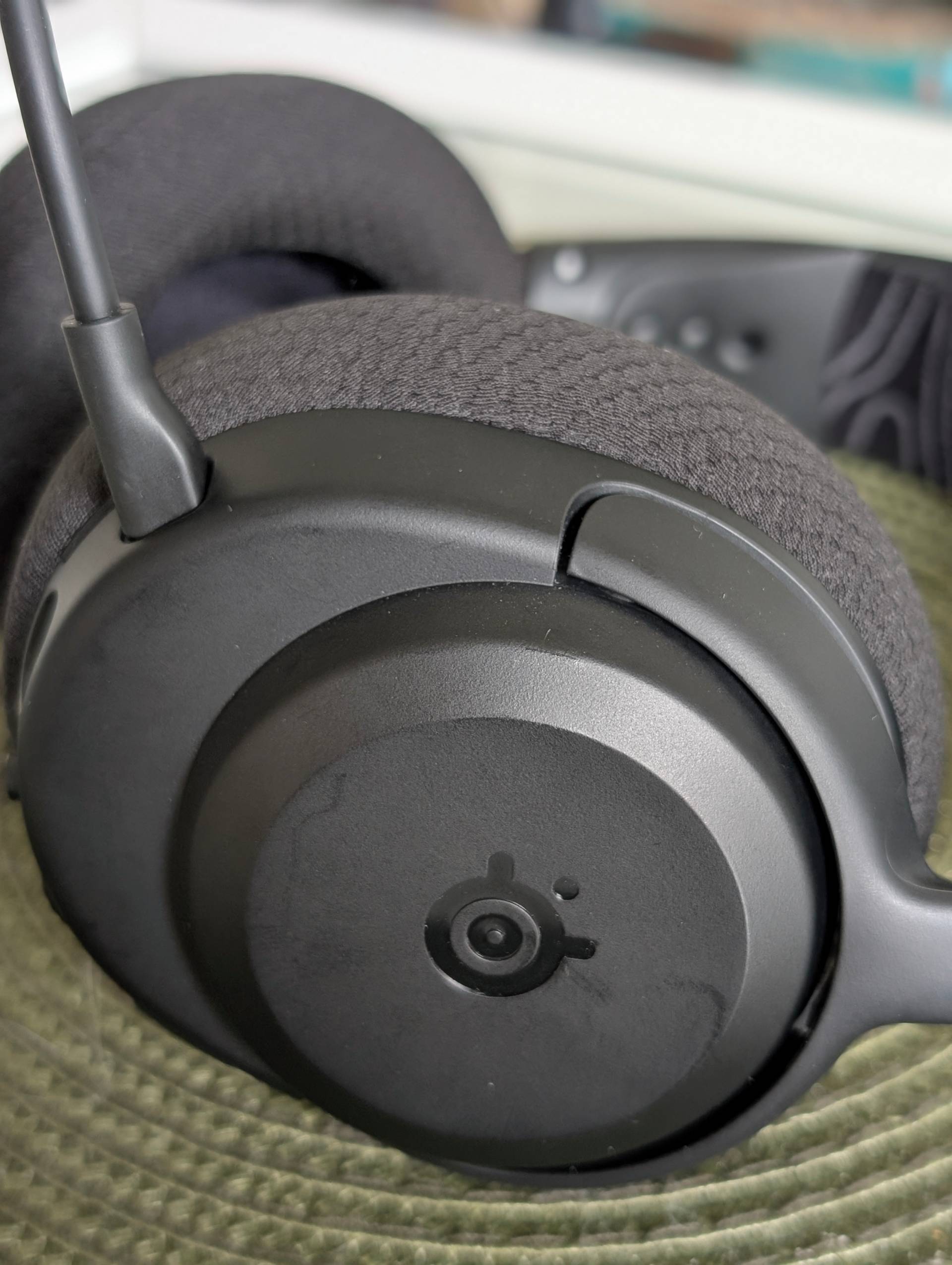 Les fourches télescopiques des oreillettes sont, elles, intégrées à l'arceau, ce qui limite les points de tension sur les plastiques, lorsqu'on retire par exemple le casque un peu trop rapidement. Ce dernier posé sur la table, les oreillettes ne retombent pas directement en clapet l'une face à l'autre, ce qui va forcément avoir un impact sur l'isolation phonique (on y reviendra). Par contre, le constructeur a eu le bon goût de laisser la possibilité de les pivoter à 90° sur l'axe vertical, ce qui permet de faciliter le transport du casque ainsi que sa mobilité autour du cou. Les coussinets extérieurs sont en tissu de bonne qualité et disposent d'un rembourrage convaincant, surtout vu le positionnement tarifaire du produit. Par contre, on sent bien la grille au-dessus des transducteurs, derrière le mince tulle en fond d'oreillette. Heureusement (et d'habitude, c'est un défaut), les oreilles ne rentrent pas totalement dans le casque, ce qui fait qu'une fois en place, on a tendance à les reposer légèrement sur le tissu et à ne pas avoir les esgourdes qui frottent sur le fond. Après plusieurs dizaines d'heures d'utilisation, le casque ayant été mon compagnon de route pendant tout le lancement de la Switch 2, je n'ai pas ressenti de gêne particulière de ce côté-là.