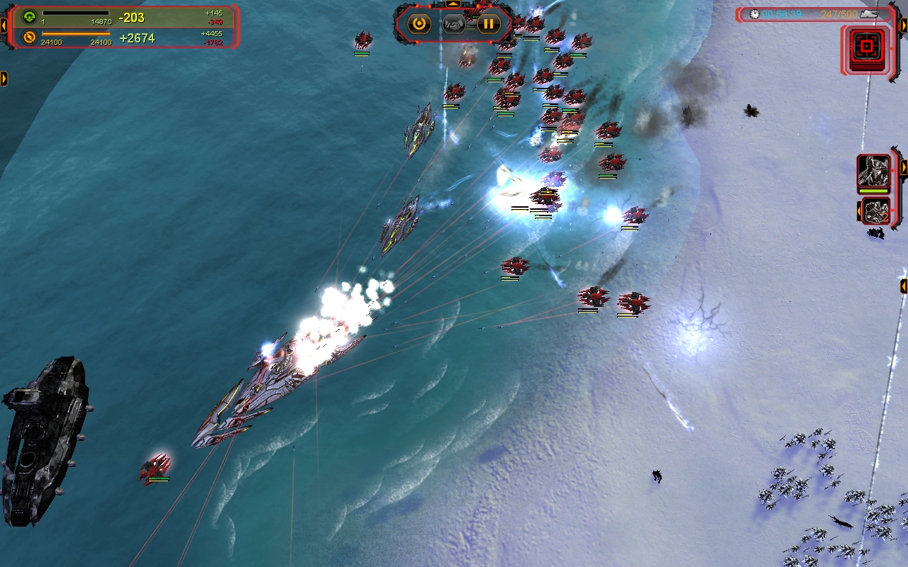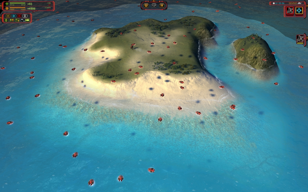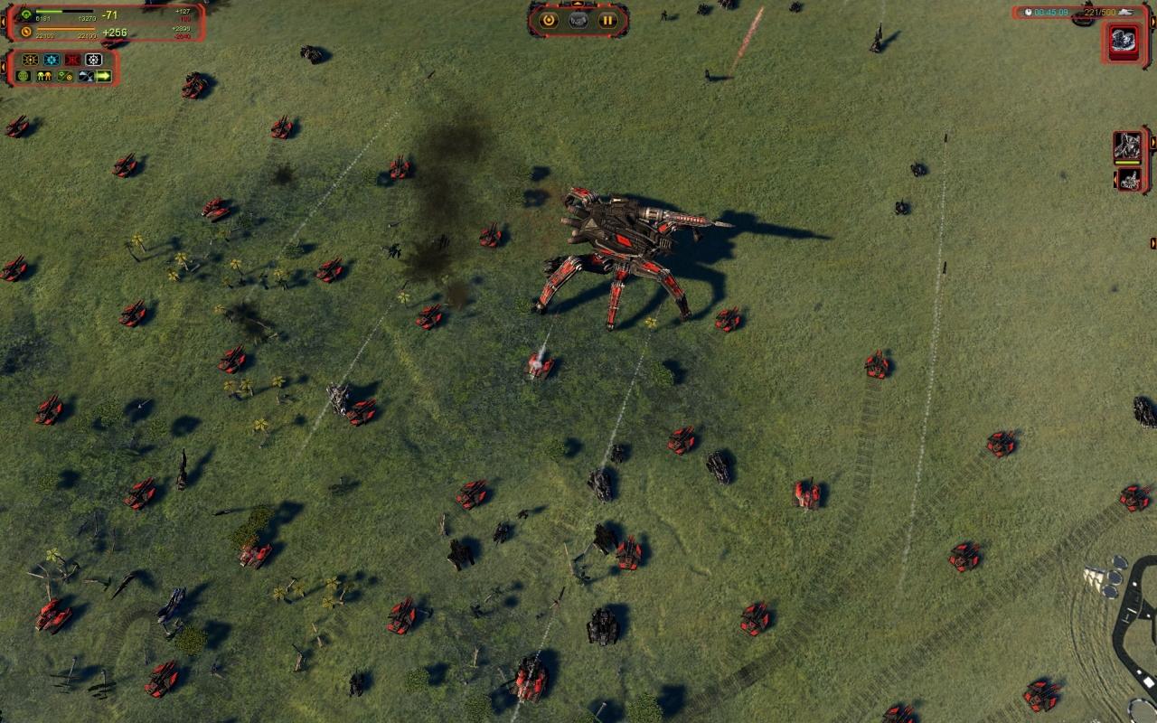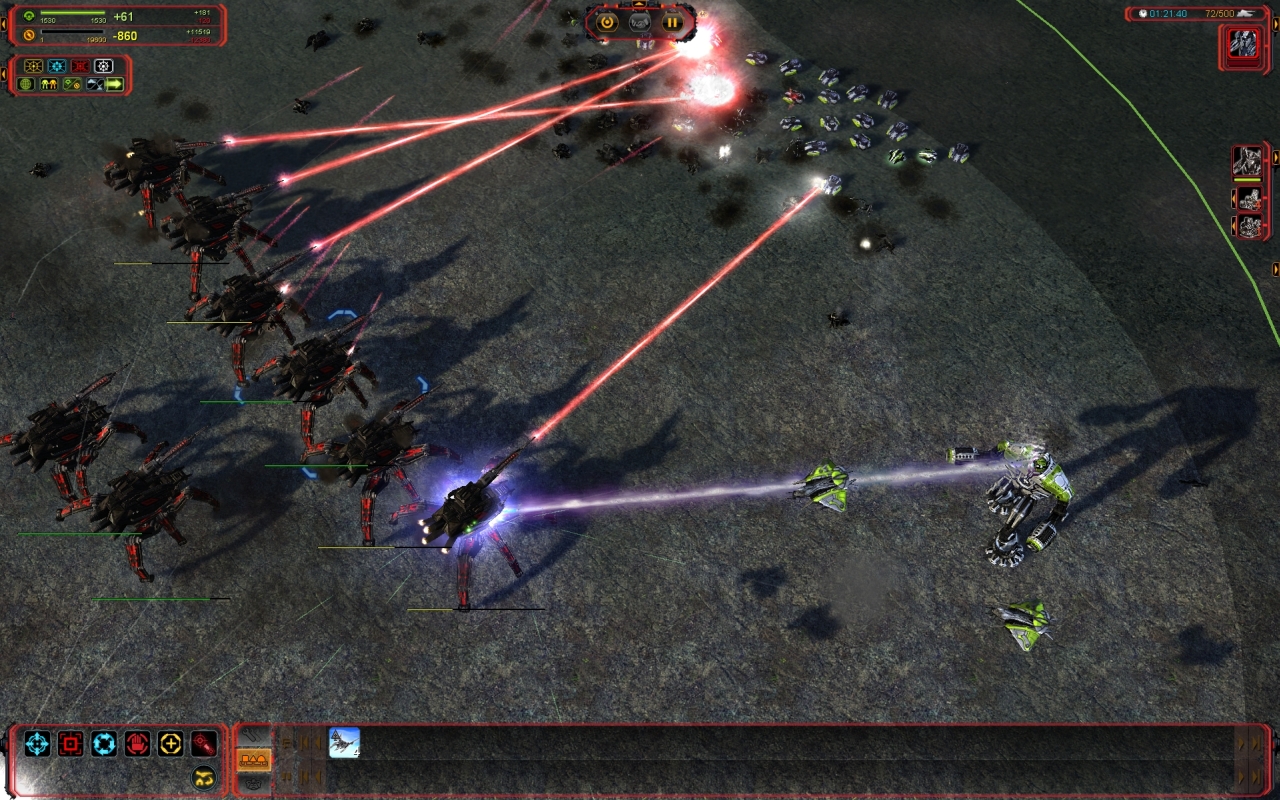 La nouvelle faction ne brille pas par son design qui fait franchement peur. Par contre elle a quelques unités sympathiques comme l’immense bombardier stratégique expérimental qui fait des ravages. Dans l’ensemble, les nouvelles unités sont assez bien équilibrées et s’intègrent bien mais on ne se dit jamais « mais comment j’ai fait pour m’en passer ». Mes petits chouchous les Cybrans ont été gâtés avec notamment un bunker sur pattes appelé The Brick tandis que les Monkeylords gagnent une grande sœur en la personne du jouissif Megalith. Les Aeons obtiennent un générateur infini de masse et d’énergie mais qui met quarante minutes pour être produit et le Novax de l’UEF, l’équivalent du Cannon à Ions de Command & Conquer, est complètement raté. Graphiquement, le jeu n’a pas beaucoup bougé. Je trouve les explosions nucléaires (par exemple celles des commandeurs) nettement moins jolies et les tirs un peu plus réussis mais ça reste de l’ordre du détail. Le jeu est encore plus gourmand mais la sortie de l’outil optimisant les performances pour les processeurs à cœurs multiples arrange les choses. Le plus frappant reste la nouvelle interface qui est désormais un modèle de discrétion et d’ergonomie.
