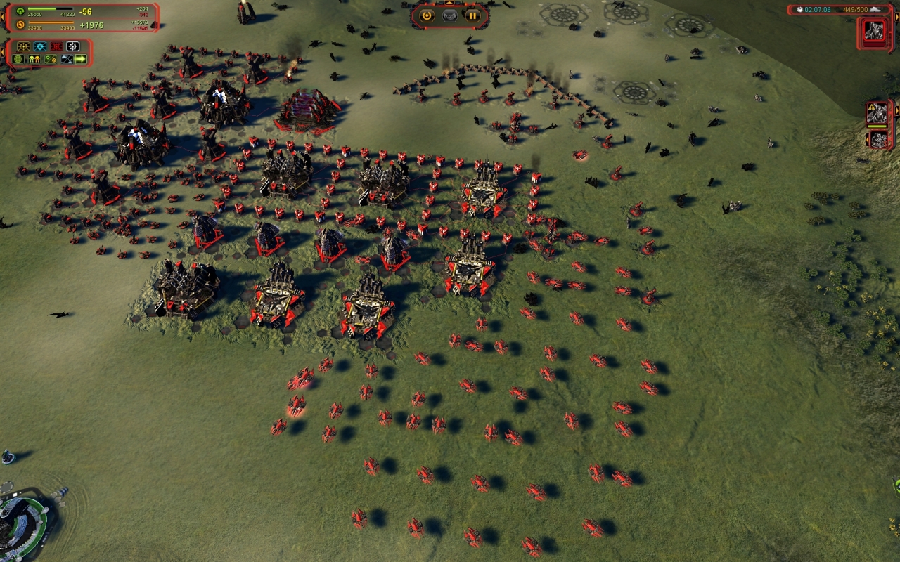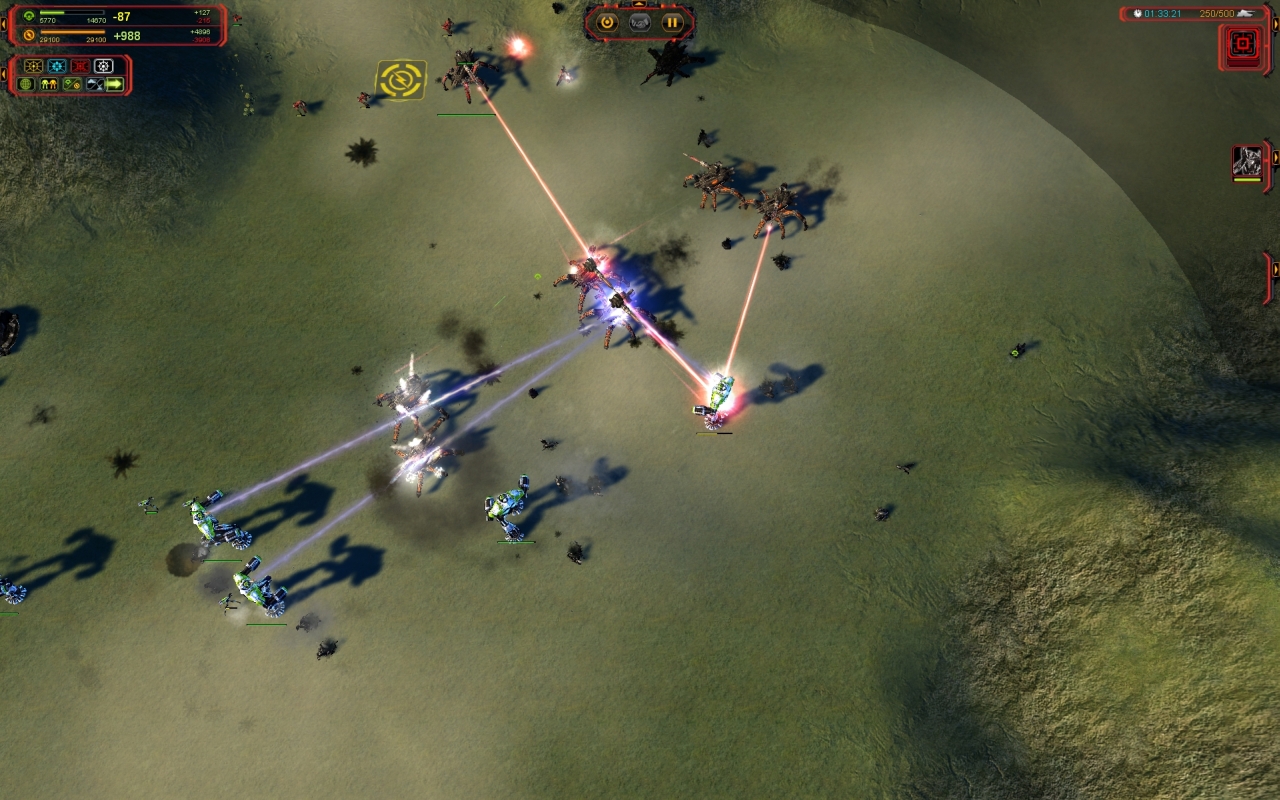 Le coût des unités expérimentales a beaucoup baissé ce qui les rend abordables. Un frisson de plaisir malsain m’a parcouru quand j’ai pu envoyer au combat une escouade de Monkeylords (les grosses araignées Cybran). Le Fatboy devient désormais une unité redoutable qu’on n’hésite pas à envoyer au combat pour pilonner les défenses. Tout cela fait partie de la réorientation offensive du titre dont on vous a longuement parlé dans la preview. En résumé, l’attaque est devenue la meilleure des défenses et le commandeur a retrouvé ses lettres de noblesses. L’ensemble du jeu est plus nerveux et plus rythmé à tel point qu’il devient dur de revenir au SupCom originel. Mais pour autant, on continue de construire des bases massives qu’on défend avec des dizaines de tourelles surtout grâce à un nouveau bâtiment qui répare automatiquement tout ce qui se trouve dans sa zone d’action. Combiné à quelques tourelles et un générateur de bouclier, ça donne un bloc de défense très solide. Ce bâtiment permet aussi de booster la production d’unités afin d’obtenir une cadence diabolique.